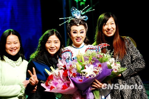 图为“台湾无敌小生”孙翠凤与献花的内地女戏迷合影。中新社发 李克祥 摄