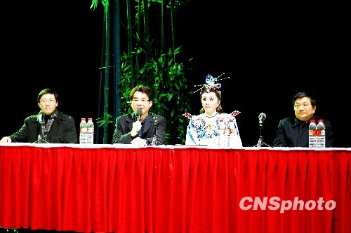 图为明华园总团长陈胜福在现场答问。中新社发 李克祥 摄