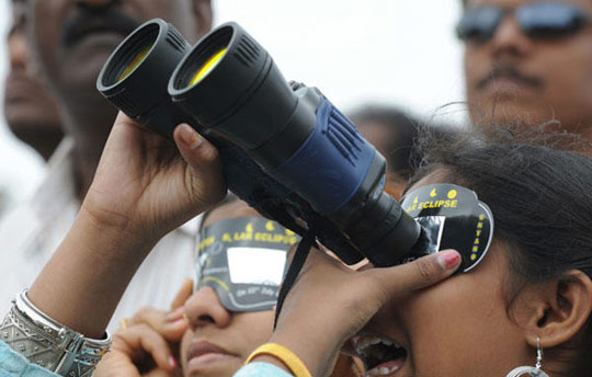 1月15日,人们在印度海得拉巴观测日食。为观测当日出现的持续时长千年一遇的日环食,印度科普组织以多种方式组织社会各界开展观测活动。