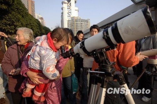 众多天文爱好者来到福建省科技馆和福州五一广场,通过各种方式观看日环食这一天文奇观。中新社发 王东明 摄