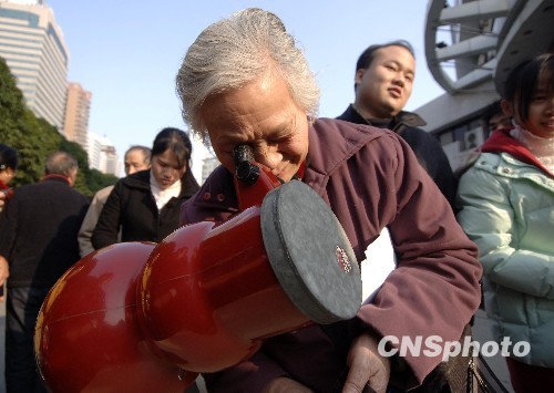 图为年届七十,退休在家的物理学科徐老师也赶来观看这一奇观。中新社发 王东明 摄