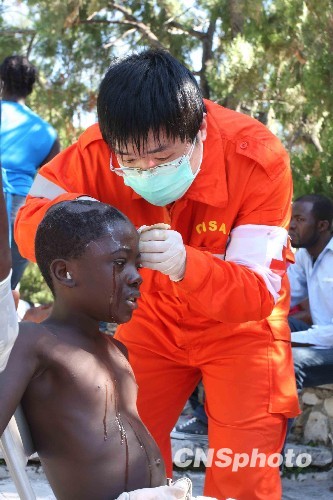 武警总医院赴海地国际救援医疗队员封耀辉正在为一个头部受伤的孩子清理伤口。无声的眼泪让世人为孩子的坚强感动。中新社发 武警总医院供稿 摄