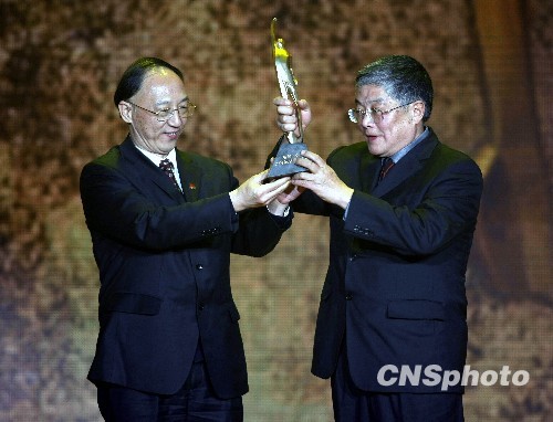 评委会大奖授予了前中国网球协会主席吕正操,他是新中国网球运动的最早倡导和参与者。由于吕老已经于2009年去世,他的长子吕彤羽代替父亲领奖,国家体育总局局长刘鹏亲自为吕彤羽颁奖。中新社发 盛佳鹏 摄