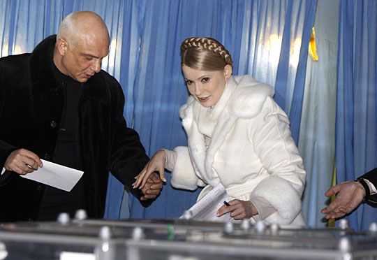 图为乌克兰现任总理季莫申科在投票后准备离开投票站。