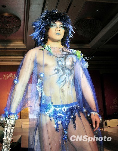 1月17日,福州秀香港服装设计师服装,图为男模秀民族透明装,别具特色。中新社发 张丽君 摄