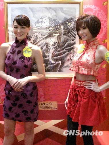 图为名模Cara G与赵硕之出席活动时在虎画前留靓影。中新社发 张勤 摄