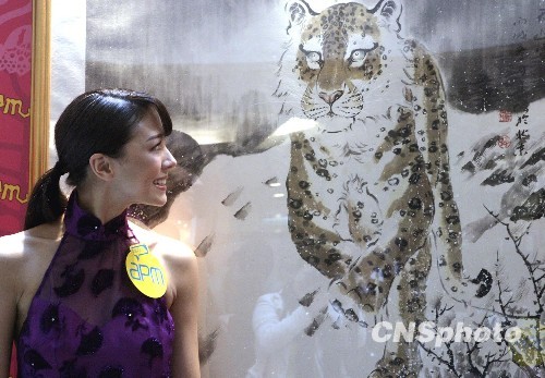 图为名模Cara G出席活动时在虎画前留靓影。中新社发 张勤 摄