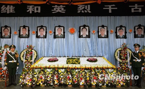 1月18日,中国公安部设立悼念堂,和社会各界共同缅怀在海地地震中牺牲的8名维和英雄。中新社发 刘震 摄