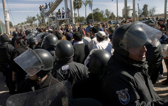当地时间1月20日,墨西哥杜兰戈州(Durango)一所监狱内两伙囚犯爆发冲突,导致至少23名囚犯死亡。墨西哥军方和警察都赶到现场进行镇压。安全人员用了40分钟才平息暴乱。图为墨西哥警察在监狱外守卫。