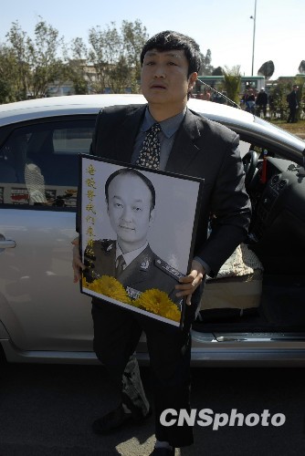 图为一位手捧李钦烈士遗像的市民赶到追悼会现场。中新社发 田洪 摄