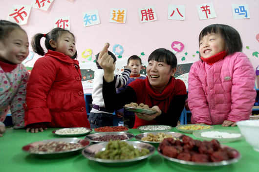 1月21日,湖北省襄樊市供销幼儿园的小朋友们就开始品尝腊八粥了,老师通过形象的食材向孩子们诉说腊八粥的故事,让孩子们了解民族传统文化。刘涛/CFP