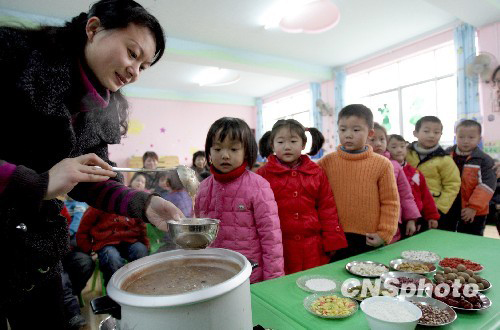 1月21日,湖北省市供销幼儿园的小朋友们就开始品尝腊八粥,老师通过形象的食材向孩子们诉说腊八粥的故事,让孩子们了解民族传统文化。 中新社发 文铭 摄