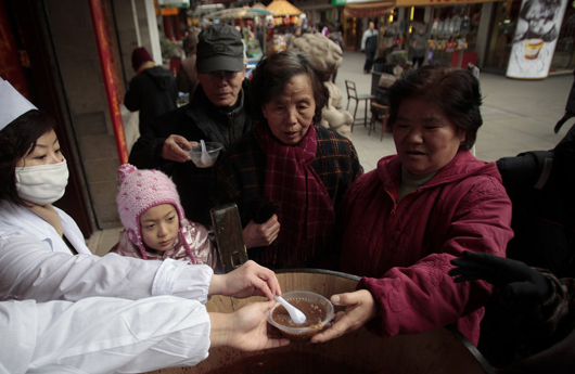 1月21日,上海豫园童涵春堂门口,民众在等待盛粥。赵静/CFP