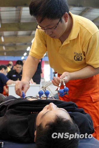 1月20日、21日连续两天,武警总医院赴海地国际救援医疗队为维和官兵及全体救援队员进行全面体检,开展3次防疫和心理疏导讲座,受到维和官兵的一致好评。据武警总医院赴海地国际救援医疗队侯世科介绍,医疗分队的主要职能是保障救援队员自身的健康、在搜救现场急救幸存者和为灾民提供医疗服务。从到达海地的第一时间,医疗队员就全天候跟随搜索队员一同工作,严防队员中暑,及时为在挖掘工作中受伤的队员包扎伤口。与以往国际救援不同的是,救援队此次居住在维和营地,医疗队主动承担起维和队员的健康保障工作。中新社发 武警总医院供稿