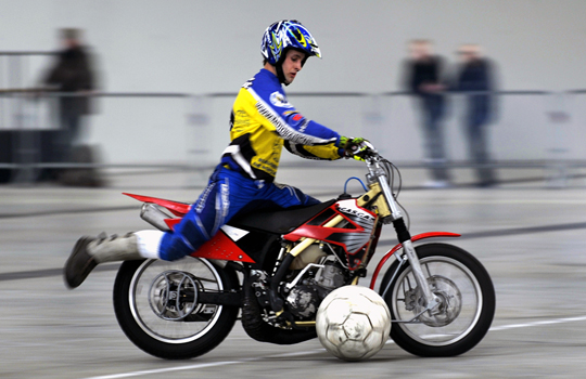 1月22日,国际摩托车贸易博览会在德国开幕,来自意大利,奥地利,荷兰,波兰,瑞士,卢森堡,匈牙利和德国等近225个公司展示了他们的最新产品。展会上,一场名为“魅力摩托”的足球比赛吸引了众人的目光,参赛者驾驶摩托的同时还不忘将足球送入对方的大门。