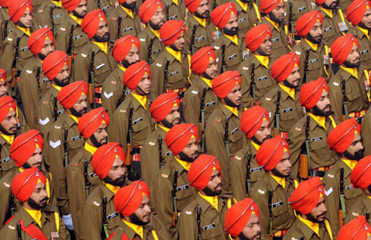 图为士兵在印度首都新德里参加共和国日阅兵彩排。