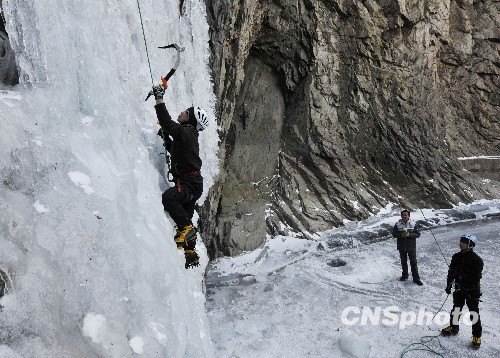 由于多日持续低温,山东省日照市五莲县七连山风景区内一处数十米高的瀑布凝结成巨大的冰瀑,十分壮观,美丽壮观的冰瀑吸引了众多攀冰爱好者前来享受大自然给他们带来的无穷乐趣。