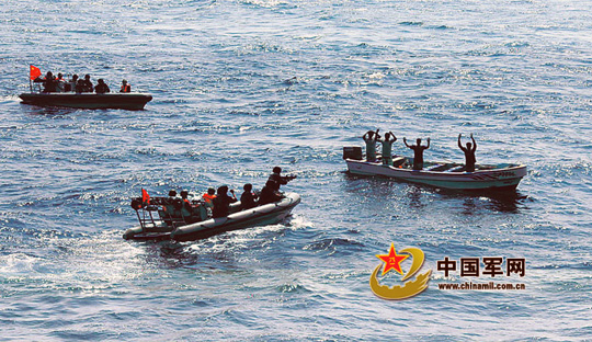 当地时间22日12时许,中国海军护航编队完成第159批船舶护送任务后约1小时,编队先后接到中国商船“乐从”号和“鸿达”号求救信号,报告遭到一艘白色快艇追击。“马鞍山”舰、“巢湖”舰和“温州”舰高速向目标机动,同时派出舰载直升机和武装小艇赶往事发海域。直升机、舰艇和武装小艇密切配合,实施空中、海面立体堵截,成功将可疑船只控制。特战队员依法对可疑船只实施了登临检查,发现白色快艇上有4名船员,装有油桶、锚钩和手机GPS定位仪等物品。在确认对商船没有威胁后,特战队员对疑似海盗快艇进行了警示驱离。