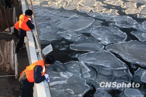 1月25日,中国海军“海冰721号”破冰船,经过三天航行到达黄海北部海域展开冰情调查。这是海军冰调队第74次到达该海域探测海冰要素和水文要素,为中国海洋开发、海洋科研、海洋生产、海上运输、航海安全等提供第一手资料。海冰721号”破冰船采用锰钢建造,船艏甲板厚达24毫米,一般船只有12毫米。它的最大撞击力能破开1米厚的冰。中新社发 张雷 摄