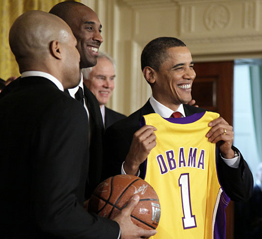 图为美国总统奥巴马(右)展示印有“奥巴马1号”的湖人队球衣。