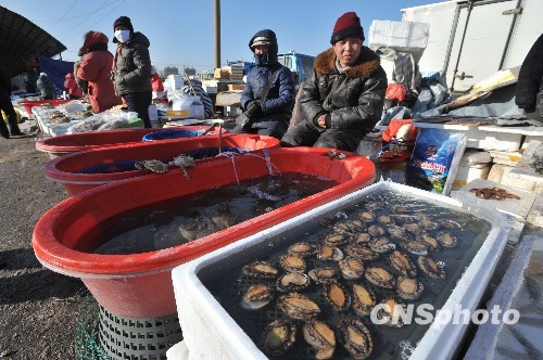 1月25日,沈阳北大营海鲜市场的业户在销售海产品。受渤海和黄海北部沿岸近30年来最严重的海冰冰情影响,海鲜捕捞量骤减。沈阳市海鲜市场的活海鲜量减价涨,花蛤、海螺等贝类,涨价幅度尤为明显。冷冻海鲜价格相对较为平稳,而随着春节临近需求的加大,海鲜价格还将上浮。