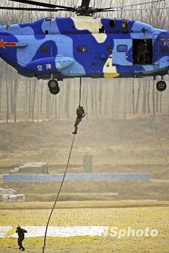 图为空降兵战斗员用绳滑方式对地面进行增援。中新社发 谭超 摄