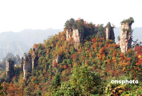 张家界林立的奇峰、竞秀的石林、陡峭的岩壁、纵横的沟壑、飘渺的云雾在漫山遍野的各种红叶、黄叶、绿叶映衬下,更显绚丽多姿,宛如画卷。 中新社发 陈子庆 摄