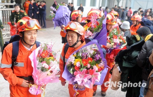 图为中国国际救援队队员抵达机场受到欢迎。中新社发 钟新 摄