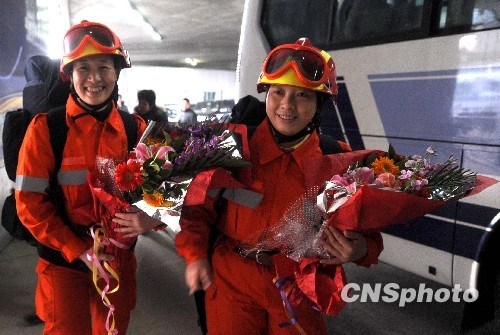 图为中国国际救援队队员走出机场。中新社发 钟新 摄