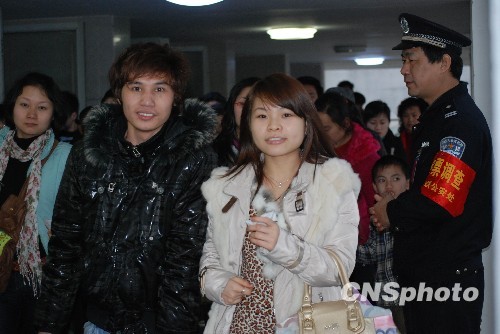 1月30日,中国春运第一天,广西铁路警察全员上岗确保中外游客平安出行,图为桂林火车站铁路警员在为游客提供乘降引导,为重点游客服务。中新社发 周利朔 摄