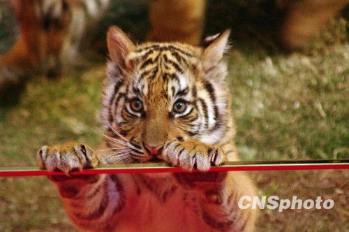 1月30日,虎年将至,重庆某商厦开展野生动物保护法宣传,“请”来几只活泼可爱的小老虎与市民近距离接触。中新社发 金城 摄