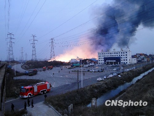 图:青岛一物流仓库露天堆场起火(2)