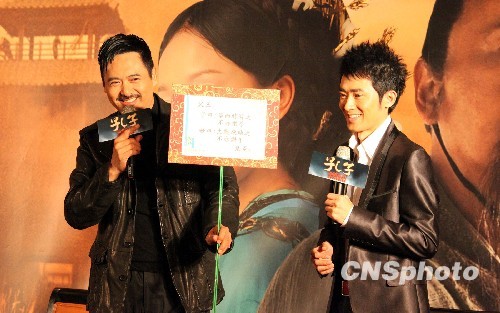 影星周润发、任泉等3日在台北市出席电影《孔子》宣传记者会,会中周润发展示周杰伦赠送花篮上的祝福语:“子曰:学而时习之,不亦说乎。吾曰:大戏欲映之,不亦赞乎。”,并署名儿臣,意为周杰伦在电影《满城尽带黄金甲》中,饰演周润发角色的儿臣。中新社发 曾嘉 摄