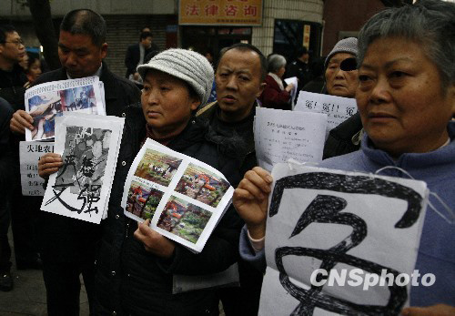 图为庭审现场外受害群众控诉。中新社发 潘钰琳 摄