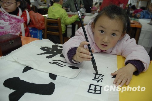 2月4日,昆明市举办了首届“百童书春、咏春比赛”活动,310多名少年儿童在活动现场用毛笔字书写赞美春天的诗句、格言,朗诵古今中外歌颂春天的诗词名篇。比赛分为幼儿组、初小组和高小组3个组别进行。图为参加比赛的一位小选手在比赛中。中新社发 田洪 摄