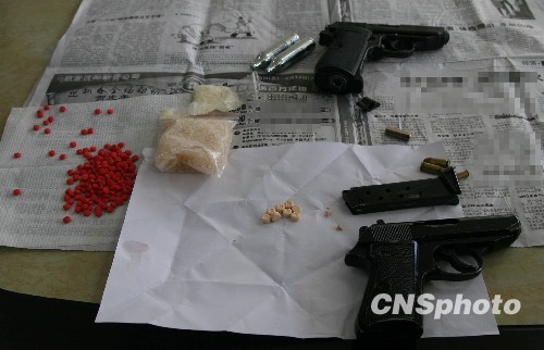 图为沈阳乘警缴获的枪支、毒品。中新社发 黄金昆 摄