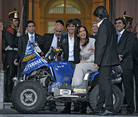 2月4日,阿根廷女总统克里斯蒂娜在布宜诺斯艾利斯总统府外与达喀尔拉力赛上的阿根廷车手共同驾驶参赛车辆。