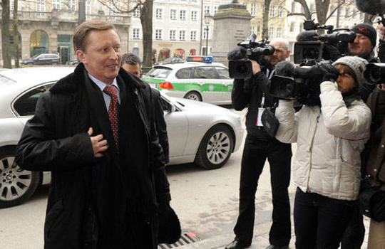 俄罗斯副总理谢尔盖·伊万诺夫(左)到达在德国慕尼黑巴伐利亚庄园酒店举行的第46届慕尼黑安全政策会议会场。