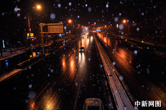 图为雪中行驶的汽车。中新网记者 金硕 摄