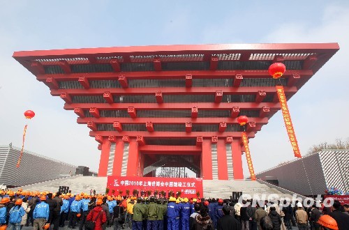 2月8日,中国2010年上海世博会标志性建筑中国馆竣工仪式在世博园举行。中国馆位于世博会规划核心区,建筑外观以“东方之冠”为构思主题,表达中国文化的精神与气质,其设计理念可以概括为:“东方之冠,鼎盛中华,天下粮仓,富庶百姓。”中国馆工程于2007年12月18日开工建设、2008年1月18日打下第一根桩,2008年12月28日钢结构封顶、2009年5月25日外幕墙挂上第一块红板。中新社发 汤彦俊 摄