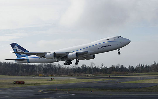 2010年2月8日,美国华盛顿州Everett,波音747-8喷气式客机进行首次试飞。747-8身长253英尺,是波音公司有史以来生产的最长飞机。与波音787梦幻飞机一样,新型747的生产也落后于预定计划一年多时间。