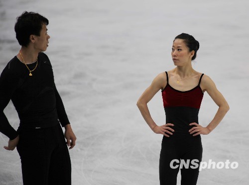 为了冬奥这块渴望以久的金牌,申雪、赵宏博这对冰坛伉俪放弃平静的幸福生活,重新回到冰场上。当地时间2月9日,他们在温哥华冬奥会花样滑冰训练馆里交谈。中新社发 赖海隆 摄