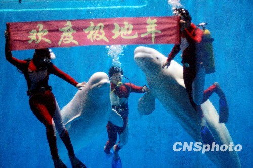 2月10日,哈尔滨极地馆一派节日的气氛,白鲸带上了花环,海鲍、鳐鱼、鯊鱼也疯狂,全体动物过大年。