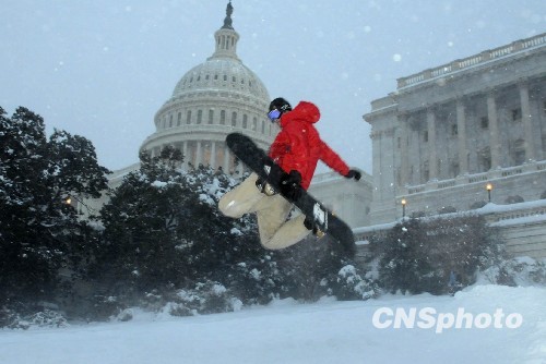 2月9日晚间至10日,一场暴风雪再度袭击美国东海岸,首都华盛顿继前几日暴风雪之后又一次陷入麻烦,政府部门关门、学校听课、机场航班取消,整个城市几乎“瘫痪”。图为10日一名滑雪爱好者在著名的国会山前滑雪。中新社发 吴庆才 摄