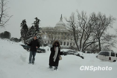 图为10日两名年轻人在国会山前向记者扔雪球。中新社发 吴庆才 摄