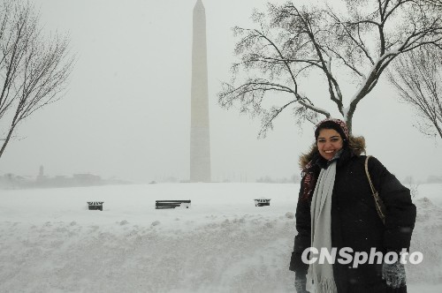 图为10日一名女孩在美国著名的华盛顿纪念碑及高及腰部的厚厚积雪旁走过。中新社发 吴庆才 摄