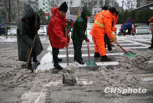 2月11日凌晨,江苏省南京市迎来降雪,江苏省气象台发布道路结冰橙色预警,市民和工作人员纷纷冒严寒扫雪除冰,保证道路畅通。中新社发 钟山 摄