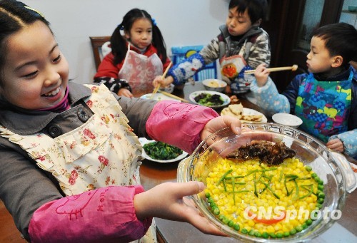 2010年2月11日,苏州平江区东中市实验小学举行了一场“学做年夜饭”活动。在老师和家长指点下,小学生们学习做炒菜、点心、水果拼盘等,希望能在大年夜饭的餐桌上为长辈们奉上几道可口菜肴。