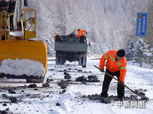 11日下午,一名公路养护员正在通往五台山的旅游公路上铺垫防滑材料。焦瑾琦 摄