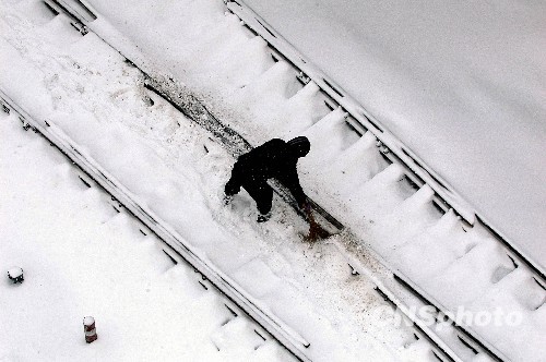 在湖集中心站站场上,职工们自发的到线路上清除线路积雪。中新社发 陈帮干 摄